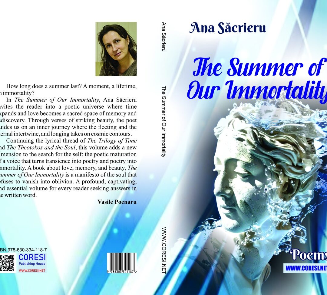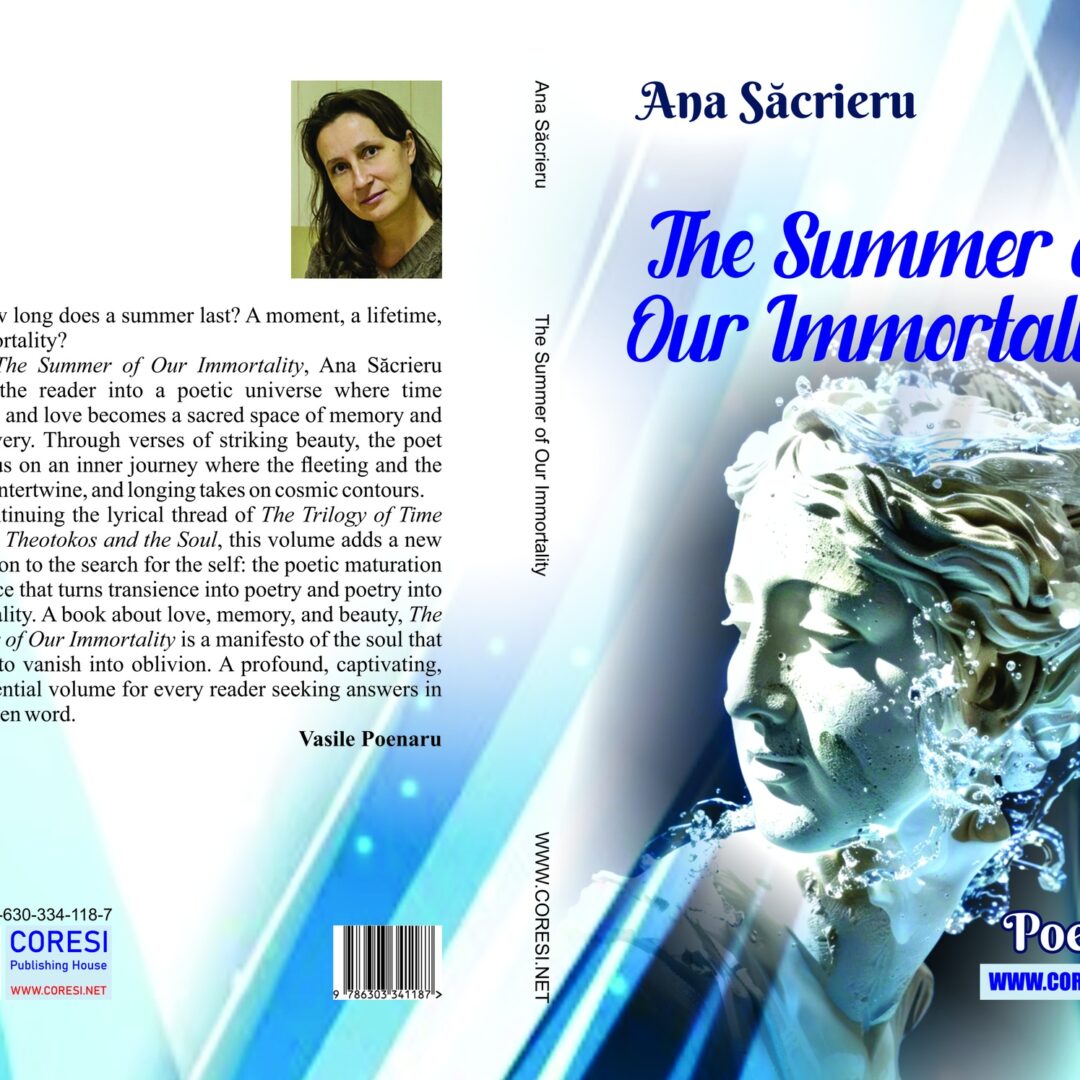 In The Summer of Our Immortality, Ana Săcrieru invites the reader into a poetic universe where time expands and love becomes a sacred space of memory and rediscovery. Through verses of striking beauty, the poet guides us on an inner journey where the fleeting and the eternal intertwine, and longing takes on cosmic contours.